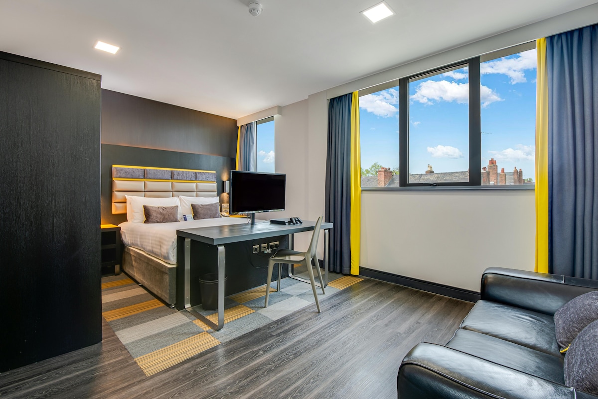 The Grande Studio at Roomzzz Chester offers a spacious and sophisticated stay, ideal for both short and long visits. Measuring approximately 30 square meters, it features a luxurious king-size bed, a stylish en-suite bathroom, a fully equipped kitchenette, and a dedicated workspace. The open-plan design ensures comfort and functionality, providing a perfect balance of relaxation and practicality.