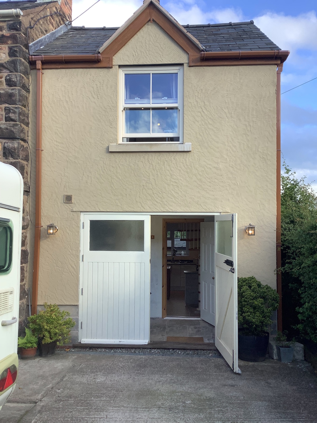 Sleeps two above oak framed garage, dogs welcome, private access, full fibre gigabit internet off road parking for one car with EV Charging point available. Double bed, reclining sofa, smart tv kitchenette with twin halogen hob, full sized oven, integrated fridge with icebox, microwave, kettle and toaster. Gateleg kitchen table sits 4 comfortably, separate shower and WC with shower fed from 120litre megastore at mains pressure. Ideal location and dog friendly (they must be able to climb stairs)
