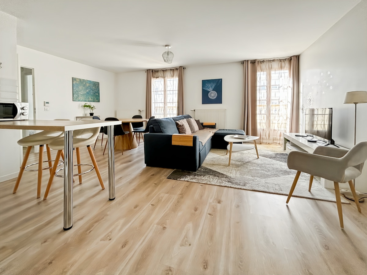 Joli appartement de 80 m2 avec 4 pièces situé à Chessy, au cœur du secteur prisé de Val d’Europe, à proximité immédiate du RER A station Val d’Europe, du Centre Commercial Val d’Europe, de La Vallée Village et des Parcs d’attraction Disneyland Paris. Comporte un salon, 3 chambres (8 vrais couchages), une cuisine entièrement équipée, une grande salle de bain avec baignoire, une salle d’eau avec douche, 2 places de parking. Avec fibre / wifi gratuit et d'une smart TV.