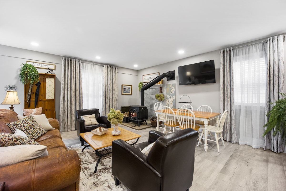 Cozy guest suite attached to main house in log cabin village. Full kitchen, dining area, wood stove, comfy queen bed, walk-in closet, games, 100 movies. Walk-in shower & built-in seat. Laundry room with door to deck area, bistro tables, firepit. The vaulted living room has pull-out love seat for one sleeper, TV [ROKU, You Tube TV, HULU, Netflix, Amazon, Disney], Blu-Ray player and Google Nest Mini. Enjoy breakfast items like fresh eggs, juice, milk, bread, coffee, tea and our homemade pizzelle.