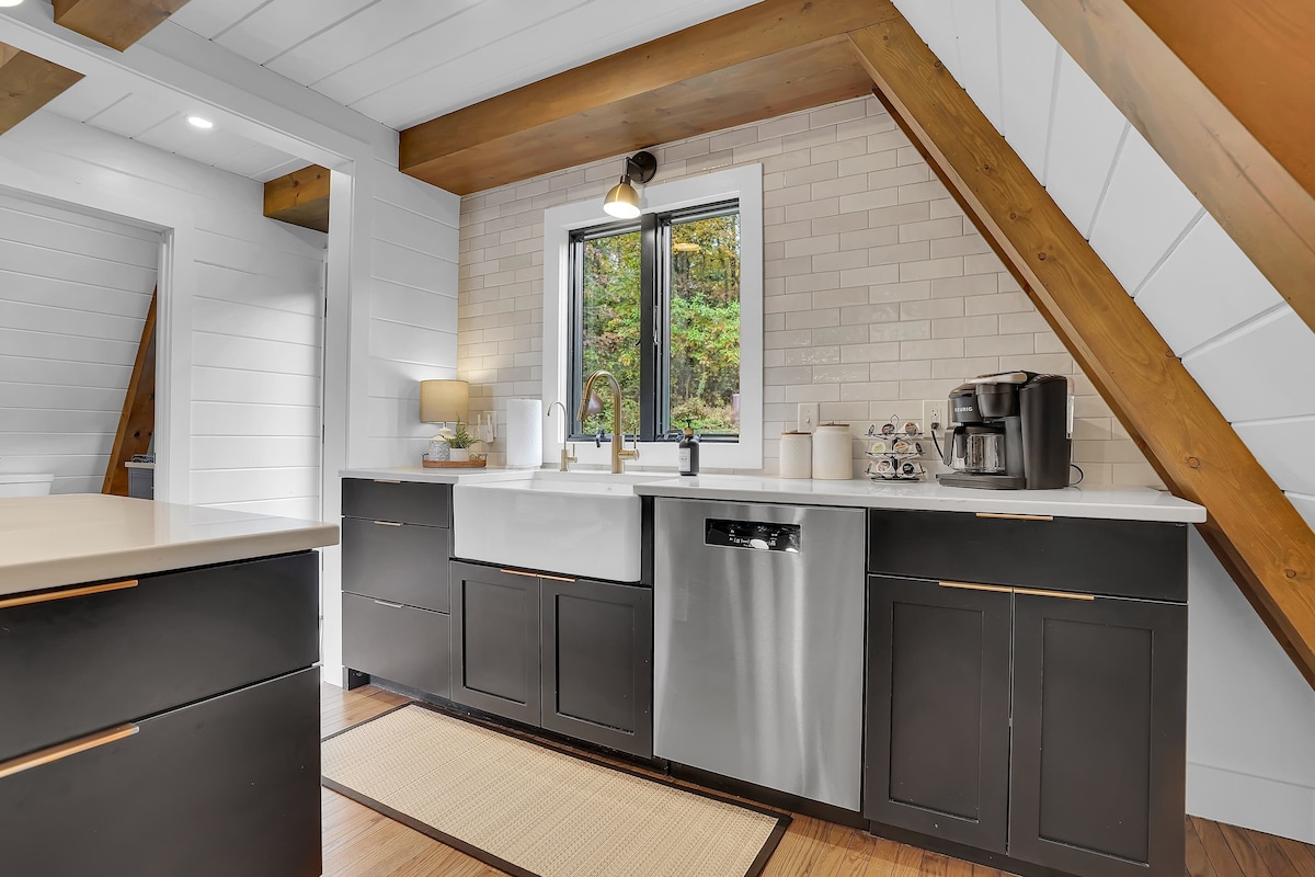 Kick back & relax in this newly built A-frame cabin with an outdoor space featuring a large deck overlooking the hillside. Enjoy the custom made cedarwood sauna, hot tub, firepit with hanging egg chairs while listening to the beautiful waterfall feature. Inside, there is a fully stocked kitchen including nespresso machine, air fryer, blender and more. King size bed with a Helix Hospitality mattress dressed with luxe Brooklinen linens & pillows. Spacious bathroom with a large stand up shower.