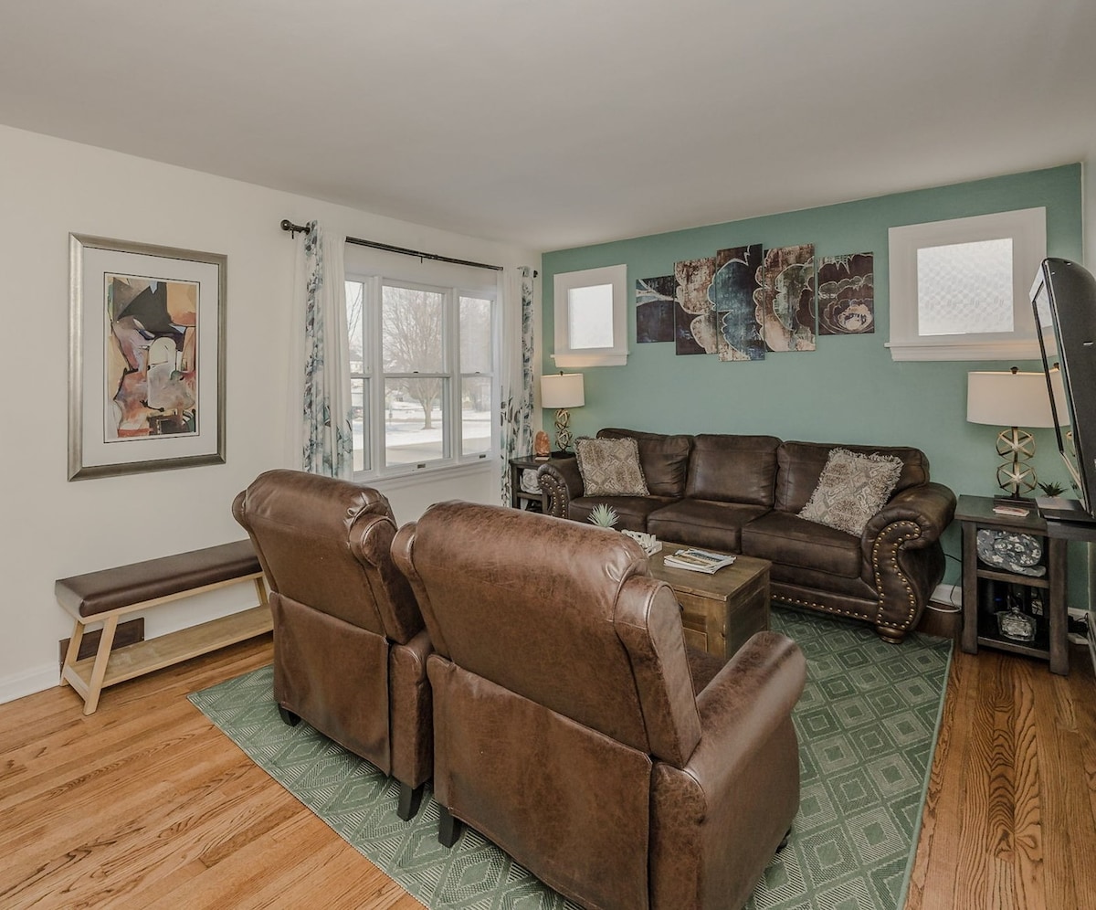 Discover your Sweet Escape in this charming 4-bedroom bungalow, just a 3-minute drive (or 20-minute walk) to Historic Main Street’s cobblestone streets, boutique shops, dining, and events. Now featuring two full bathrooms, including a newly added second-floor bath for extra convenience. Enjoy a game-filled basement with pool table, ping-pong, foosball, and darts, plus yard games, a fire pit, and cozy nights with board games and DVDs. Sleep soundly on plush beds with room-darkening curtains.