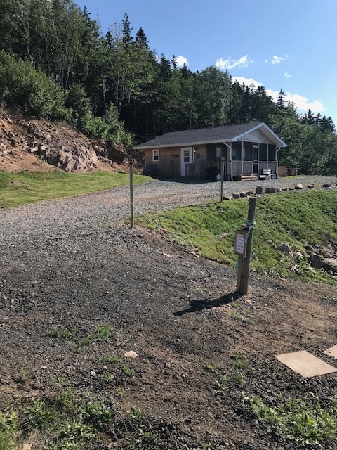 A cozy private cabin right on the water. Loft bedroom, kitchenette, bathroom and large screened porch make it the perfect getaway. The cabin sits at waters edge, in a saltwater bay with easy water access and quiet woodlands behind. Solar powered with amenities including wifi and lights. Propane heat, cook stove, water. Firepit, bbq, picnic table. Just minutes north of the Cape Breton Highlands National Park. Less than 1km from sandy barrier beaches and ocean swimming. Two kayaks on site