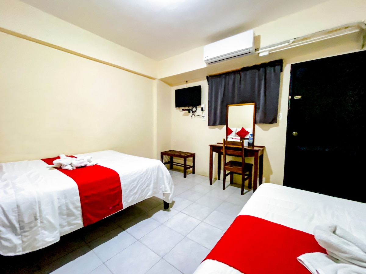 Mini hotel en el centro de Chetumal, recién remodelado, con habitaciones modernas, cómodas y totalmente equipadas: aire acondicionado, TV, baño privado, frigobar, área de trabajo y perchero. Ubicación estratégica para explorar Bacalar (30 min), Mahahual (1h30) y Tulum (2h), además del Boulevard Bahía (10 min) con restaurantes, bares y paseo frente al mar. Ideal para viajeros de placer o negocios que buscan comodidad, buena ubicación y fácil acceso a los principales atractivos.