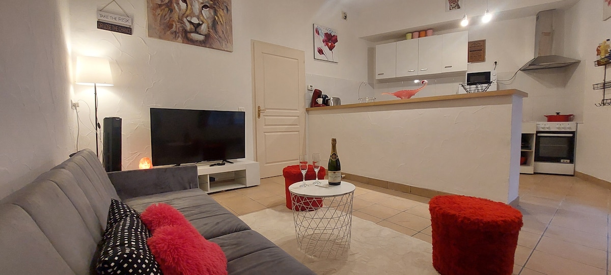 Dans un immeuble ancien doté d'une cour commune (style patio) en hyper centre, cet appartement se situe au deuxième étage une petite copropriété tranquille. Spacieux (60m²) et très lumineux. Il se compose d'une grande pièce de vie avec cuisine équipéé (four, micro-ondes, lave linge séchant, TV, ect..), d'un coin repas et salon, d'une grande chambre avec literie neuve (queen size) ainsi qu'une salle de bain avec douche. Des produits de base sont à disposition Fêtes et rassemblements interdits.