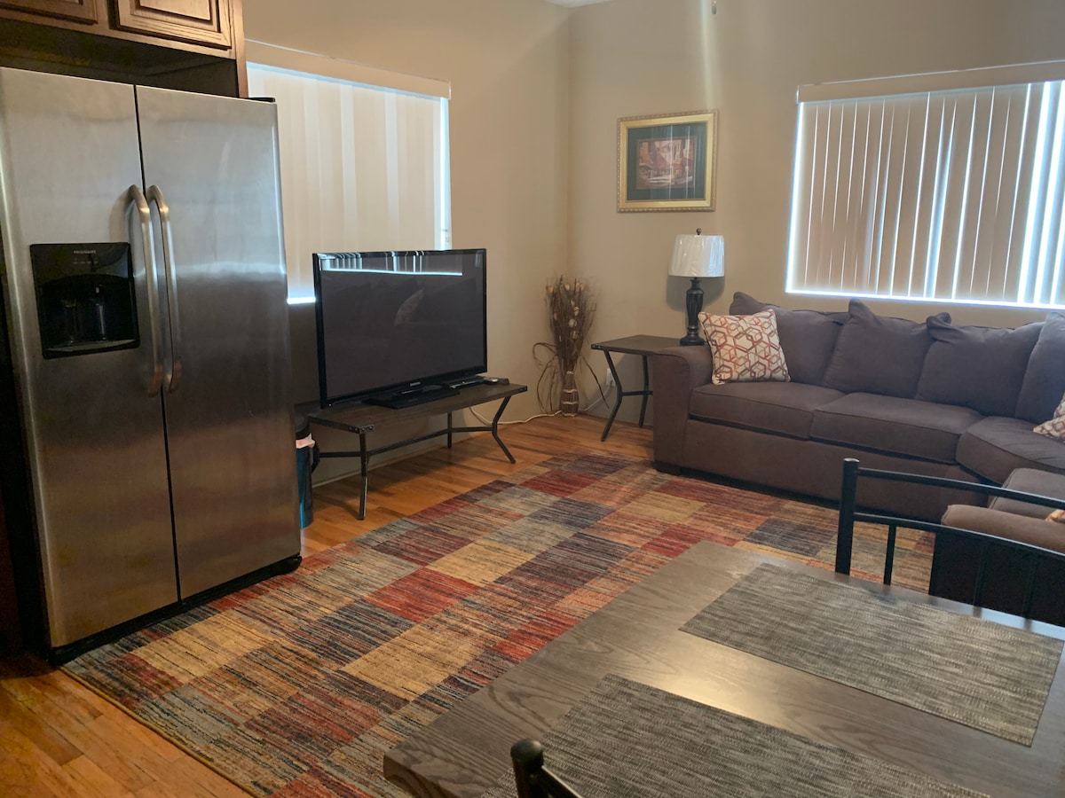 This property was built just to host our guests. This suite is great for long term stays. It is located on a quiet cul-de-sac in a beautiful north location right off Interstate 25. This is a fully self contained suite. Pull up in your private driveway, enter the access code, and enjoy. This property features a master bedroom with a full on suite bathroom and walk-in closet. Open concept living room with couch, TV, large bar and kitchen. Peaceful outdoor patio and yard.