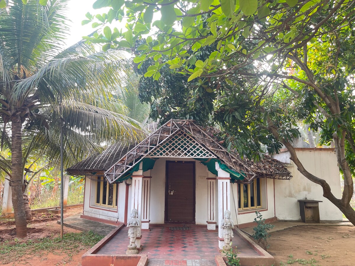 Forget your worries in this spacious and serene space. Escape to a peaceful coconut garden cottage surrounded by lush greenery and fresh air. This traditional hut-style stay offers a relaxing farm experience with comfortable interiors, natural surroundings, and plenty of open space. Perfect for families, couples, and friends looking to unwind, enjoy nature, and experience village tranquility.