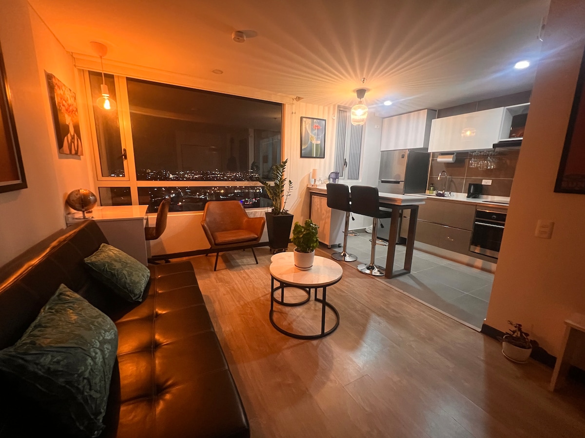 Enjoy a stylish experience in this new studio apartment of 323 ft2. Fully furnished and equipped with a washer-dryer, kitchen, refrigerator, Smart TV, WiFi, Queen bed, dining room and modern work and relaxation areas in the building. Beautiful view of the mountains of the eastern savannah of Bogotá.