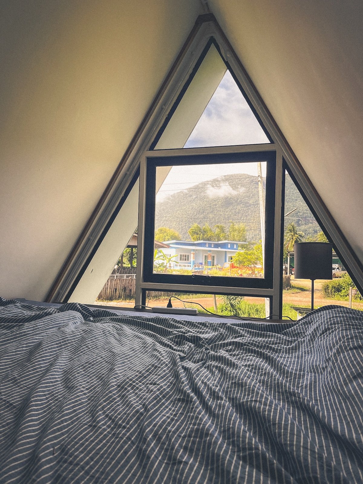 Raised high from the ground, Compact triangular wooden cabin house on an orchard. It looks simple from the outside but filled with the right amount of magic inside. When the door is opened You will find a peaceful mezzanine area. It is an open balcony to receive sounds of the forest and “Doi Luang” Mama mountain, Heart of ChiangDao Caregiver. Make it a private space hidden inside. When evening came, walked out to a side,There is a decent sized open kitchen. Let us cook &season our time together.