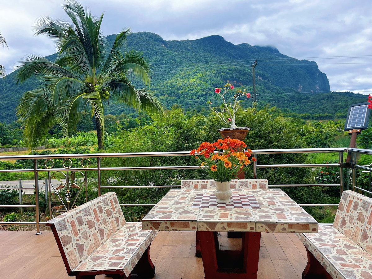 Entire house, Country home style with 1 bedroom 1 bathroom and mountain view private balcony. 1 out of 6 houses in Nitan Village. Each house is peaceful and has private entry. Only 5 mins walk to the city of Chiang Dao. Spacious land where you can relax and rest in nature. Enjoy the breath-taking views of Chiang Dao mountain from your balcony but with a few minutes walk finds the center of this small city where you can enjoy cafes, street food and local restaurants.