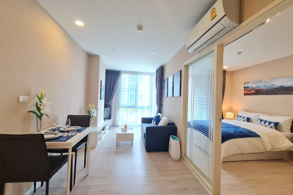Welcome to your stylish home-away-from-home in the heart of Nimman. This rare, 41m² corner unit on the 6th floor offers spacious comfort and clean elegance. Savor tranquil Doi Suthep Mountain ⛰ views as the sun sets. Evenings invite cozy movie nights on the HUGE 60" Smart TV with a mini theater. A convenient sofa bed sleeps two extra guests for seamless family travel. One Nimman and Maya Mall are minutes away on foot. Enjoy the pool and fitness facilities for a complete, and relaxing stay.