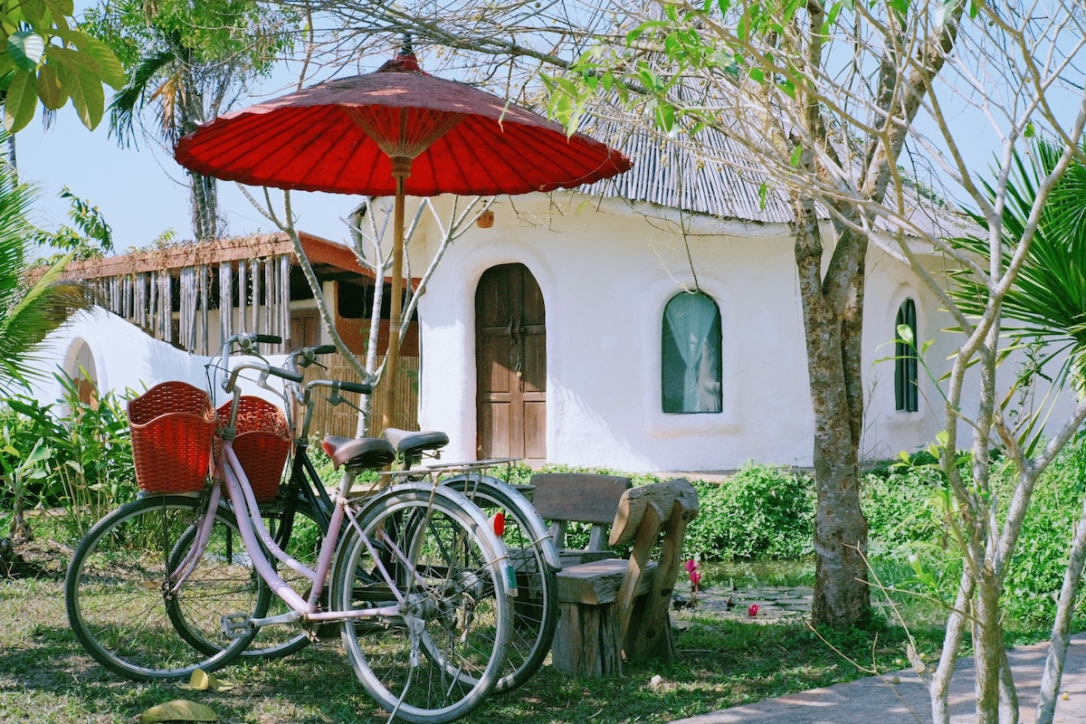 Embrace yourself in the rustic charm of a small village living - Lovely people, artisan culture and peaceful nature. This gorgeous mud houses - The Back to Earth Chiang Mai - is nested among beautiful rice paddies, less than 20kms for the city. You will be staying in the mud house created entirely by hand by your host, Mr. Adul - one of Thailand leading on sustainability living. We've Tie-dye workshop and coffee workshop available. We also hike every Sat which you could join with small fees.