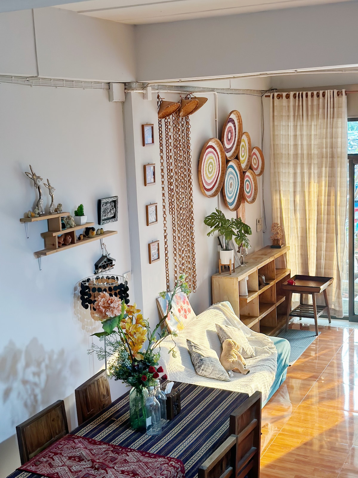 嗨!欢迎您来我家做客。我们很幸运地在市中心附近有一个大院子。这个木屋特别适合都市人来做短暂休息和放松,这里有非常适合放空的大花园和13米长的泳池。房子设计理念来自传统泰北农村的兰纳谷仓(二楼卧室、一楼存放生产资料、厨房及休息空间),我们在此基础把传统的房子改成更高空间、拥有更多采光,也在楼上楼下都配有洗漱卫生间。同时我们非常喜欢日式房屋内装的简约,所以做了融合。此外,房子里的古董家具和摆设都是我们过去几年在清迈所淘来,有些刚好和房子非常搭配,就随心地布置了。房子里的艺术画作均来自我孩子的父亲,他是本地艺术家。 如果您预定,将会使用整栋房子及花园和游泳池,房客会有独立的入口,另一侧是房东居住,因花园足够大,两个房子之间有20-30米距离,彼此都有足够的私密性。 抱歉,我们暂时不分开预定房间。 厨房提供全面的烹饪工具和厨餐具,还有洗衣机和烘干机。我们平时生活状态比较灵活休闲,周末可以带房客练瑜伽、徒步爬山、一起逛菜市场做泰餐、或一起玩水彩画画,如有兴趣,请主动给信号哦!