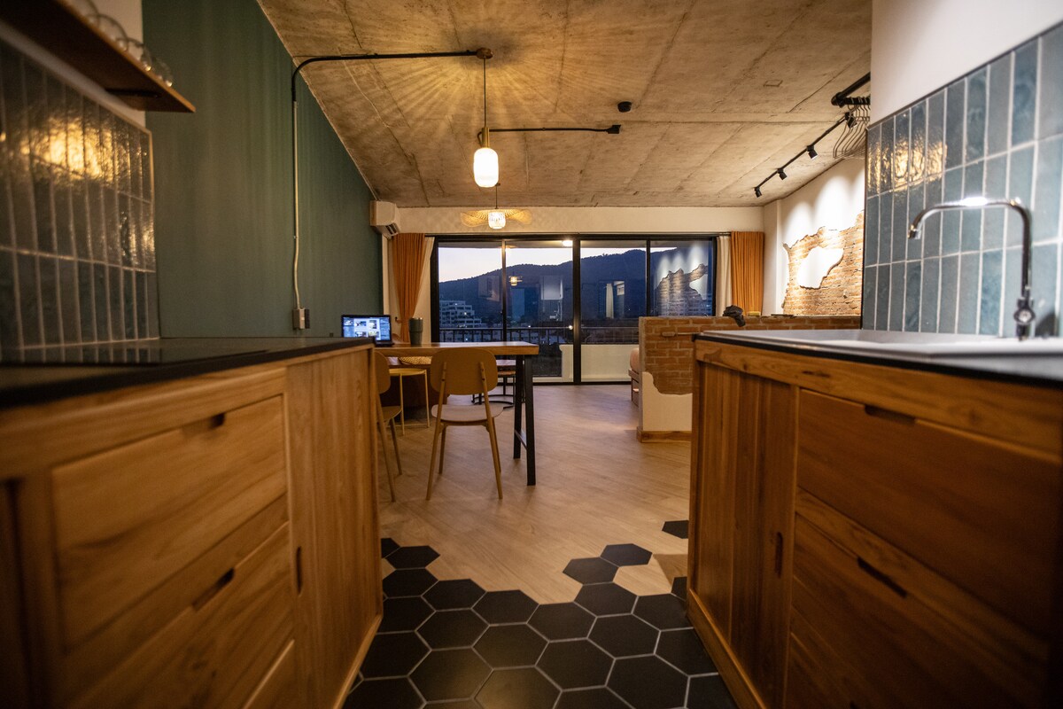 ✨ Modern Loft Style @ Center of Nimman! Stay in unparalleled style. This 31m² one-bedroom loft on the 4th floor offers a nice mountain view and chic, contemporary decor. You are surrounded by trendy places. Hang out at our signature rooftop pool and sky fitness while enjoying breathtaking sunsets—it's the perfect reward! You're in the center of the action: 5 min walk to One Nimman/Maya; 2 mins to chic bars/cafés. Complimentary indoor parking and a lovely garden. Book your stylish stay today!