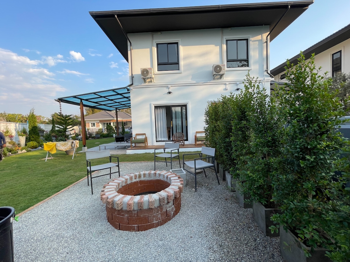 Relax with the whole family at this peaceful place to stay.a two-story-house for 5 people in the middle of go forest on our private mountain which is 10 mins from the white temple and singha park and only 5 km to the highest waterfall in Chiang Rai where you can trek and swim.the room has 60 sq.m. balcony and fire pit behind the house