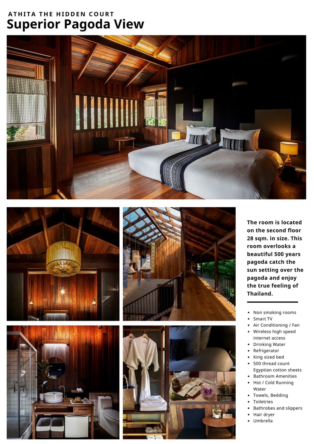 Welcome Promotion พิเศษห้องละ 2500 บาท/วัน (พักได้ 2 ท่าน หรือมาคนเดียวก็คิดเท่านี้) ห้องพักมี 2 ห้อง แบบA : เรือนไม้ชั้นเดียว แบบB : เรือนไม้สองชั้น มีบริการรับ-ส่งสนามบิน(มีค่าใช้จ่าย)อาหารเช้าให้เลือก แบบA: English Breakfast + ชา กาแฟ ขนมปัง ผลไม้ แบบB : ไทยๆข้าวต้มเครื่อง ข้าวต้มกุ๊ย หรือโจ๊ก + ชา กาแฟ ขนมปัง ผลไม้*ของกำนัลในห้อง น้ำดื่ม เครื่องดื่ม เบียร์ห้องละ2กระป๋อง/วัน ส่วนขนมนู่นนี่แล้วแต่จะหาได้จากตลาดสด *Surprise Dinnerสูตรเสน่หาฟรี 1มื้อ(ช่วงเทศกาลราคาอาจมีการปรับเปลี่ยนเล็กน้อย)