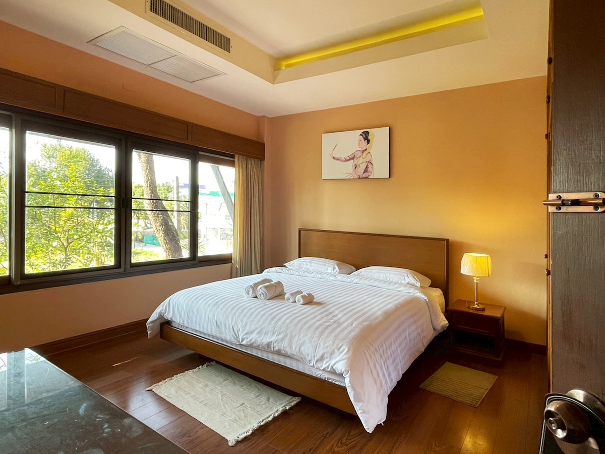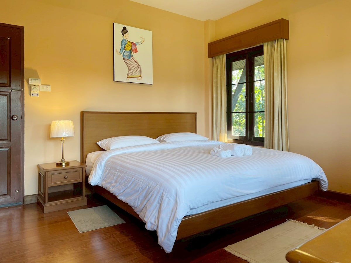 "A peaceful riverside retreat in warm Lanna Thai style" Baan Tharawana is a relaxing nature retreat located by the river, surrounded by green gardens. The atmosphere is quiet, private, and peaceful The house features traditional Thai-inspired architecture with wide, open-air balconies that allow natural light and fresh air to flow through. There is a spacious common area where guests can relax, or even work in a calm and comfortable environment.