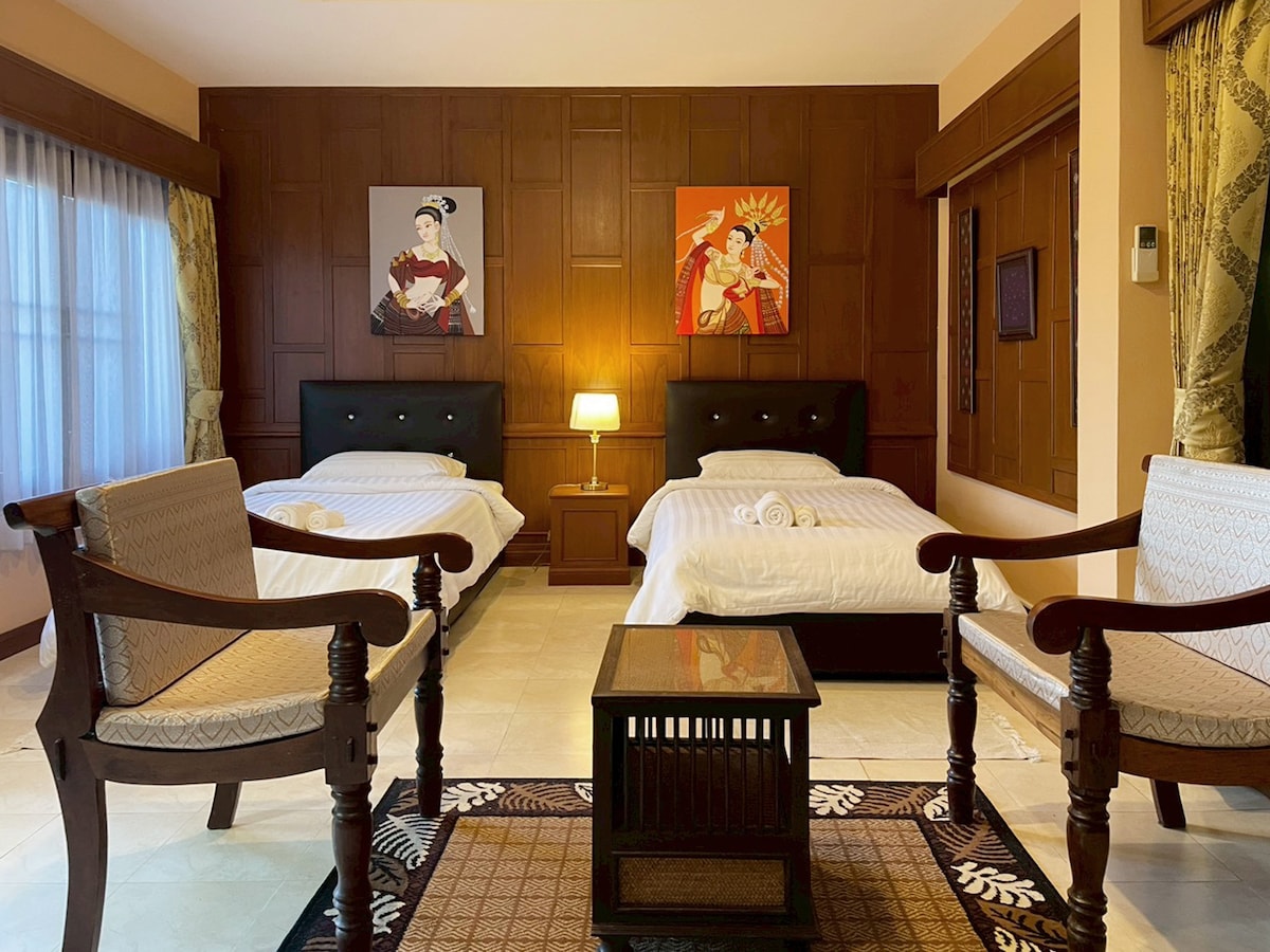 โซนห้องรับรองแขก บ้านไม้สักทรงล้านนาประยุกต์ ห้องแอร์ 2 เตียง เสริมที่นอนบนพื้น 2 ที่ รองรับผู้เข้าพักได้ 4 คน