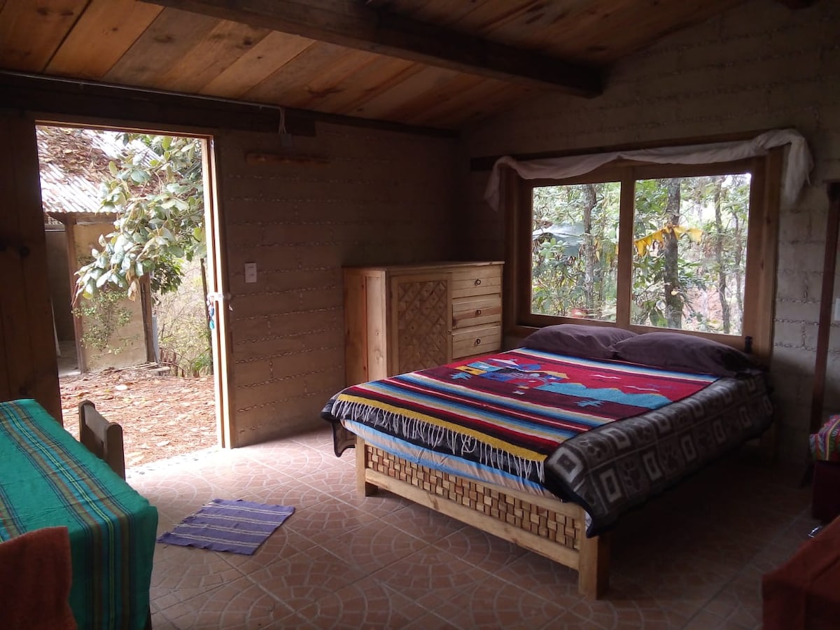 1 bedroom-loft. Complete Kitchen. Ideal for camping. Campfire. Dry bath. Hot water. Organic breakfast or meals on good price, previous request. Cultivation of organic vegetables and bioconstruction. Beautiful views! Next to the forest and a stream, near the springs of Huitepec. Large trees, epiphytes, birds. Fruit trees, organic vegetables, medicinal herbs, chickens, ducks, rabbits... WiFi. Calm and safe. Friendly and cheerful. Combi 15 minutes from the city center. 30 min walking.