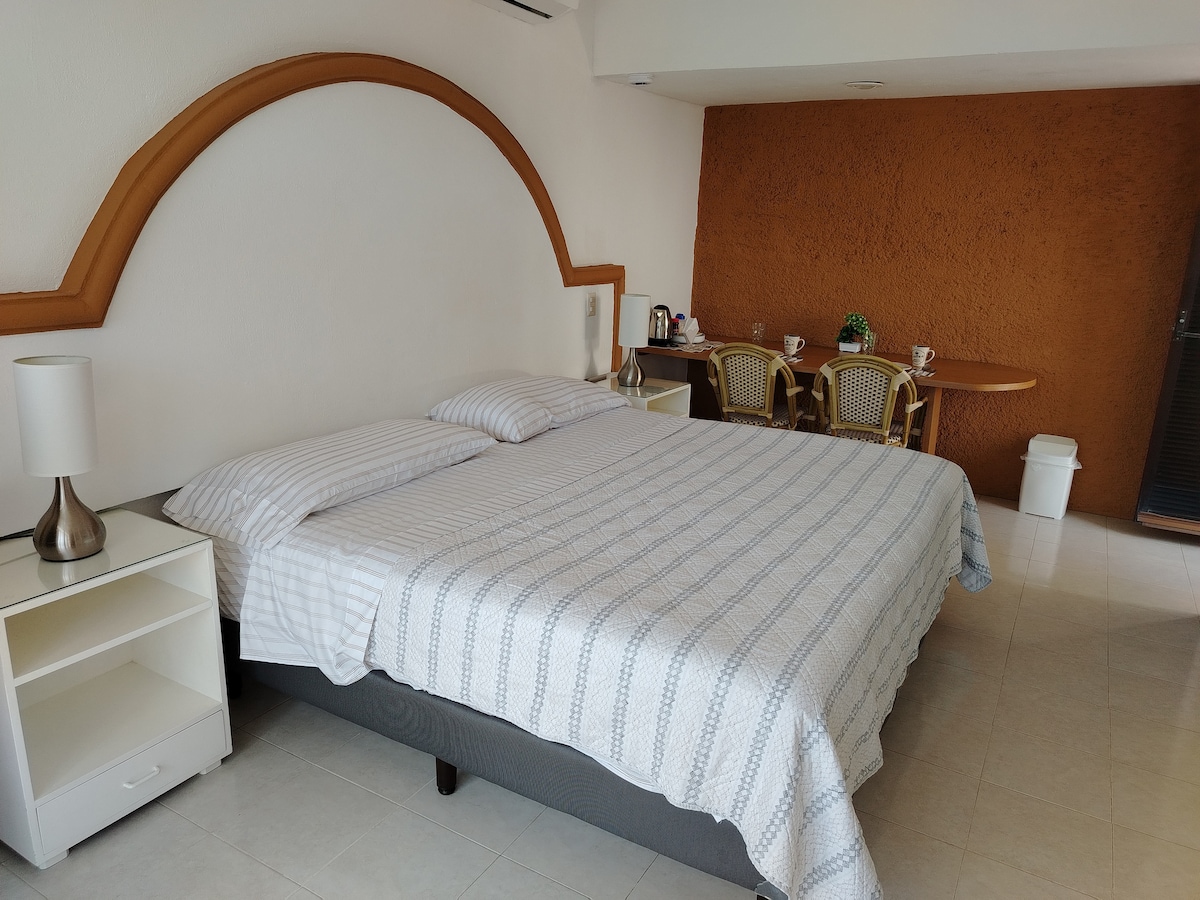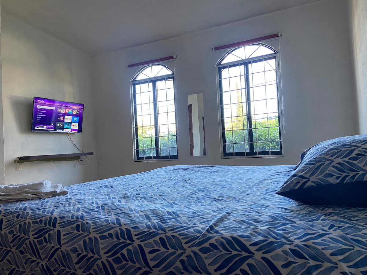 Pequeña habitación hasta para 2 personas se encuentra en un 3 nivel. Esta en un condominio de 3 departamentos con acceso limitado y seguro. La habitación cuenta cama matrimonial, Buro con lámpara, aire acondicionado, ventilador de techo, smart tv de 32”, barra / escritorio con frigobar, microondas, licuadora, parrilla eléctrica, vajilla, cubiertos y vasos para 2 personas, olla y sartén, baño con closet.