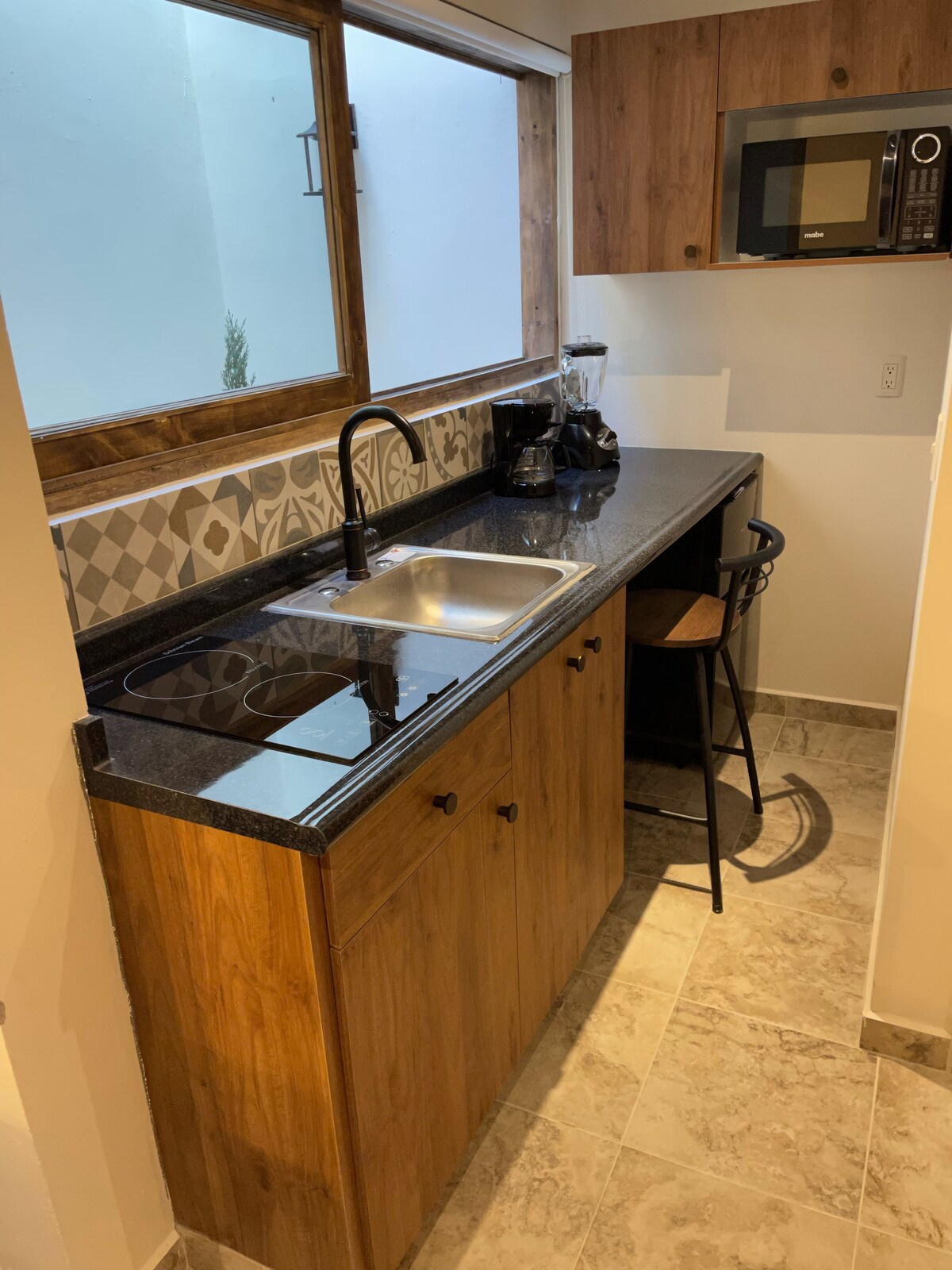 Departamento dúplex, en la planta baja está la cocina, barra para alimentos, baño y una pequeña salita, en la parte alta está la recámara con una cama king size y sofá cama, muy bien iluminado con luz natural. Tiene una vista al jardín de la propiedad espectacular y el espacio es propio para descansar, meditar y encontrarte contigo. Dotada de servicios que puedes requerir para una estancia larga y cómoda, cerca de todo, a cuatro cuadras del centro y el bullicio, puedes caminar con seguridad.