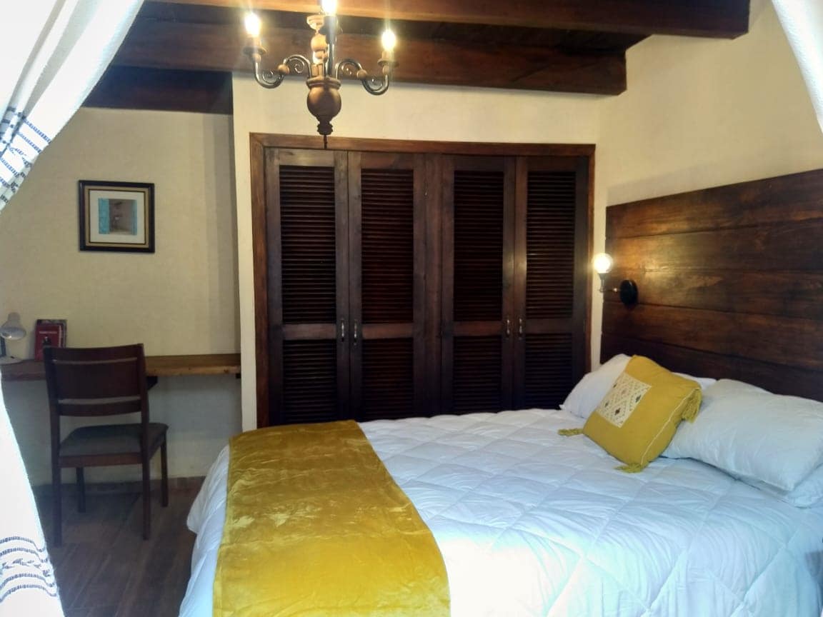 Amplio Departamento de dos plantas a solo 5 cuadras de la concurrida calle Real de Guadalupe. Se encuentra en una propiedad muy segura y con vista a un hermoso jardín. Cuenta con 1 cama king size, 1 cama matrimonial, sala de tv, baño con vestidor, cocina equipada, sala con chimenea, internet WIFI de alta velocidad y una cómoda oficina. Terraza con su mesa, sillas y hamaquero. También cuenta con lavadora y secadora en las instalaciones para uso de los huéspedes.