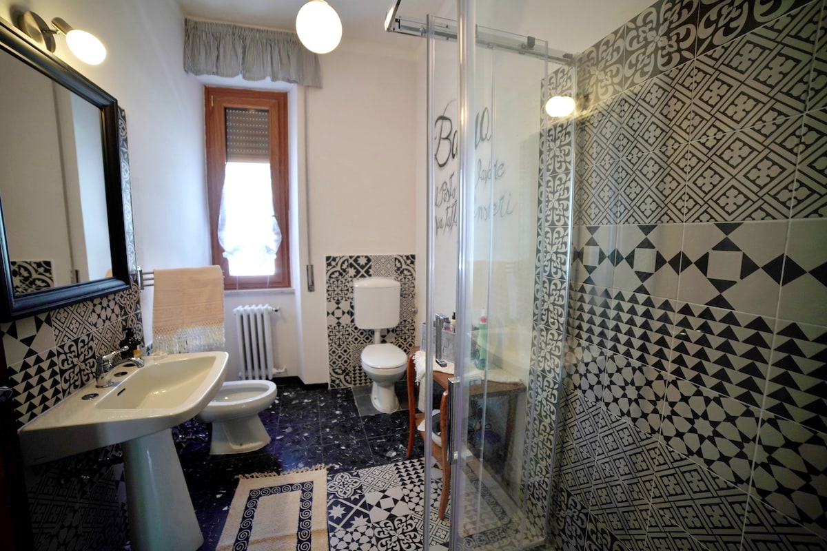 CIN: IT010025C154B4A6Y2 One double bedroom, one single bedroom, ( folding bed) en-suite private bathroom and 50 sq m terrace (with a stunning view on the whole city) inside my house ( we live in) Total privacy and independence. Free Wi-Fi, air conditioning, coffee/tea station. The house is in walking distance from the city centre. The weather is pleasant all year round. From here, you can also go on day-trips to the world renowned Portofino and 5 terre. Free private Parking space available.
