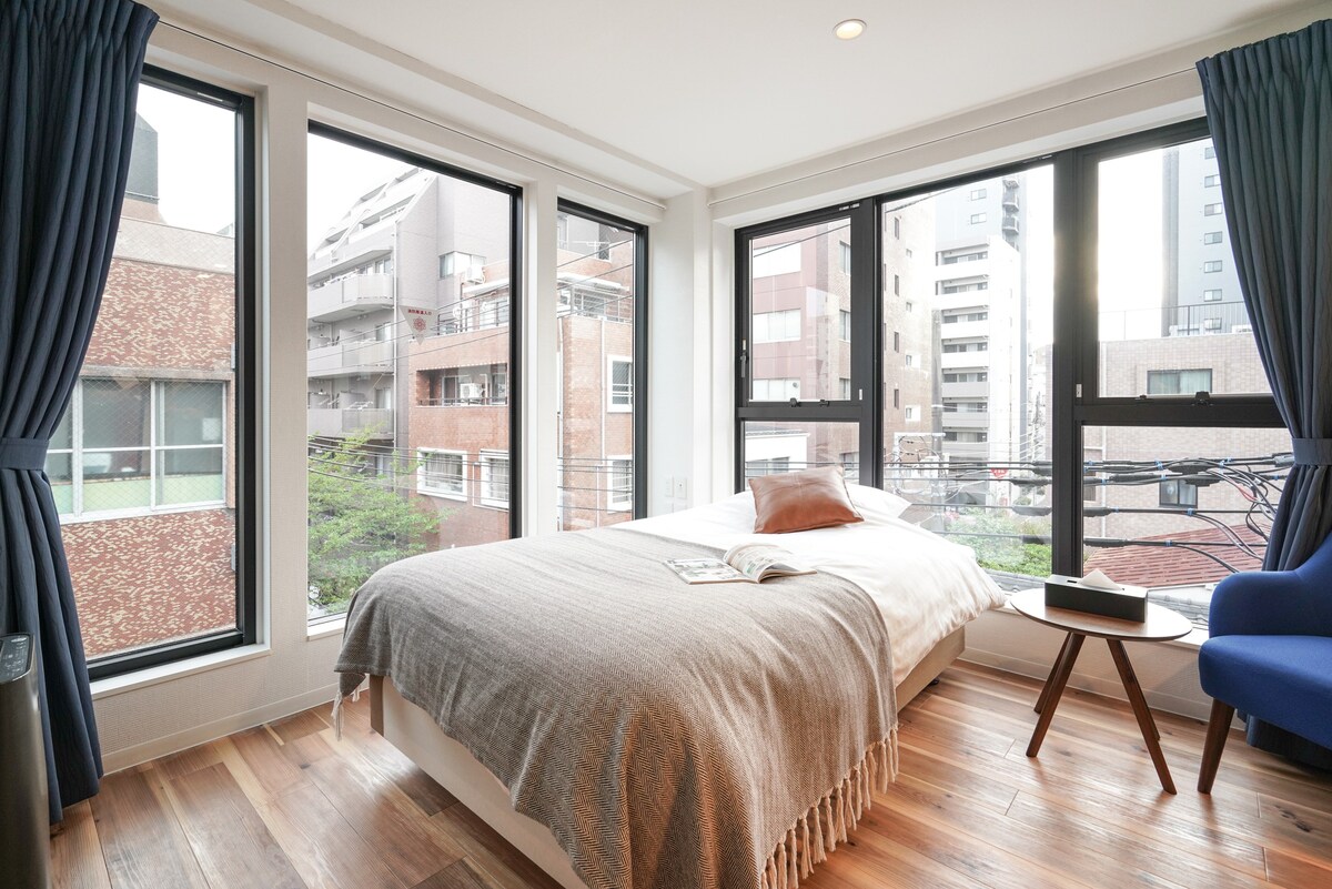 Stay in our designer hotel in Minato Ward, Tokyo, just 3min from JR Tamachi Sta. and 6min from Mita Sta. This 50m² studio, designed by a rising architect A.Hamatani, accommodates up to 8 guests with four W beds, offering a blend of modern style and comfort. With direct access from Narita (64min) and Haneda (32min) airports, and easy train links to Tokyo Tower, Roppongi, and Ginza, it’s perfect for sightseeing. Nearby, enjoy excellent restaurants &stores. Ideal for groups, families & biz use.
