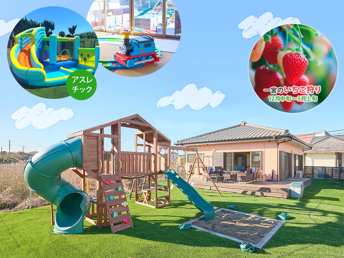 ※天然芝の庭・BBQコーナー・駐車場・トイレはご到着日13:00からご利用頂けます!ゆっくりとお過ごしください。 ※ロハスに過ごせる一棟貸しのゲストハウスがサーフタウン「一宮町」に誕生しました。実力派建築家が設計したおしゃれな建物です。 ※とにかく清潔第一です! ※敷地全体がフェンスで囲まれているのでお子様や愛犬も安心して庭遊びができます。 ※コンドミニアム2部屋と独立したラウンジ・子供ルーム、150坪の天然芝の庭&BBQコーナーすべてが貸し切りです。 ワンちゃんのいないグループのご宿泊も大歓迎です。 ※東京から車で1時間半の自然豊かな空間。砂浜で遊んだり、サーフィンを楽しんだり、波音を聞きながら美しい星空を眺めたり。 ※BBQに必要な器具、炭、皿・コップ、クーラーボックス等は全て揃っています。食材だけをお持ちください。(屋外でのオーディオのご使用、大声・歓声などはお控えください) ※BBQコーナーは大きな屋根の下です。雨天でもバーベキューをお楽しみいただけます。 ※砂浜までは歩いて3分です。庭に温水シャワーがあるので海遊びの後も快適です。