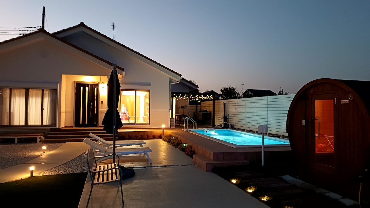 好評サウナルーム(通年設置) ロウリュして温まった身体をプール・外気浴へ ■定員最大6名様となります お子様の追加は要相談 ルアナプールヴィラ一宮 全室プールビューのリゾートスタイル♪一宮海岸迄歩いて数分。一軒家貸切りの贅沢平屋ヴィラ リビングの特大ハンモックはお昼寝に最適!プライベートな空間で寛ぐプチビーチリゾート 水の音や美しい水面が癒し(温水プールではないです) 駐車場3台完備 歩いて直ぐコンビニあり便利◎ ■BBQ可能!要予約(有料)お問い合わせ下さい ☆BBQコンロ・炭等機材一式 ☆食材はお客様でご用意お願い致します ☆安全管理上持込み器具はお断りしてます ■人気ビストロ「ル・ペパン」の前菜ケータリング可。予約時にお問い合わせ下さい ■ゆったりとご利用希望は4名様が◎ ※20歳未満の方のみでのご利用お断りします ※静かなエリアの為、大騒ぎしたい皆様はご遠慮願います ※宿泊者以外の入室は固くお断りします ※苦情、ルール違反発覚の際は即時退室頂きます ■宿泊リクエスト受付後メッセージ送らせて頂きます ご返信が無い場合リクエスト却下となりますのでご注意ください