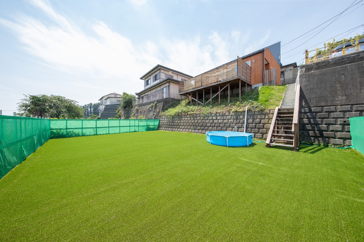\2025年7月 プレオープン/ 250坪の広々敷地を丸々貸し切り! 室内フルリノベーション、天井が高く開放的な広々空間! 大人8名まで宿泊可能です! サーフィンで有名な一宮ビーチまで徒歩圏内。 駐車場4〜5台可能。 夏季限定簡易プール、外水道温水シャワー、サッカーゴール、BBQ、屋外リビングソファがあります。 木陰でのんびりお過ごしください! 家族旅行、グループ旅行、リトリートに最適です! 少年サッカーチームや、フットサルの選手たちが盛り上がること間違いなしの天然芝の庭でサッカーを楽しんでください! 宿周辺は森があり、静かな環境です。フェンスに囲まれているので、プライベート空間が確保されています! 貸し出し用のBBQコンロ、ピザ窯、流しそうめんキットもご用意あります! ぜひみなさんでワイワイ楽しんでください! ・ ・ ・