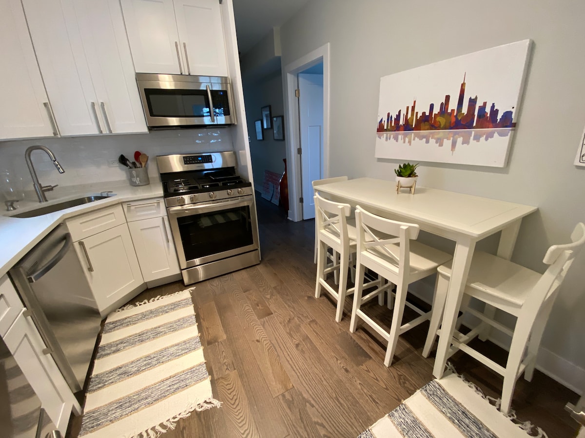 Located in West Town in the heart of Noble Square, just north of West Loop with access to all the best restaurants and only minutes away from River North and Old town, enjoy this 4 bedroom, 3.5 bath condo with private parking, 2 living spaces, heated floors throughout the entire lower level and steam showers. A gourmet kitchen stocked with everything you will need including an espresso maker. This home is perfect for families, couples, friends or traveling for business.