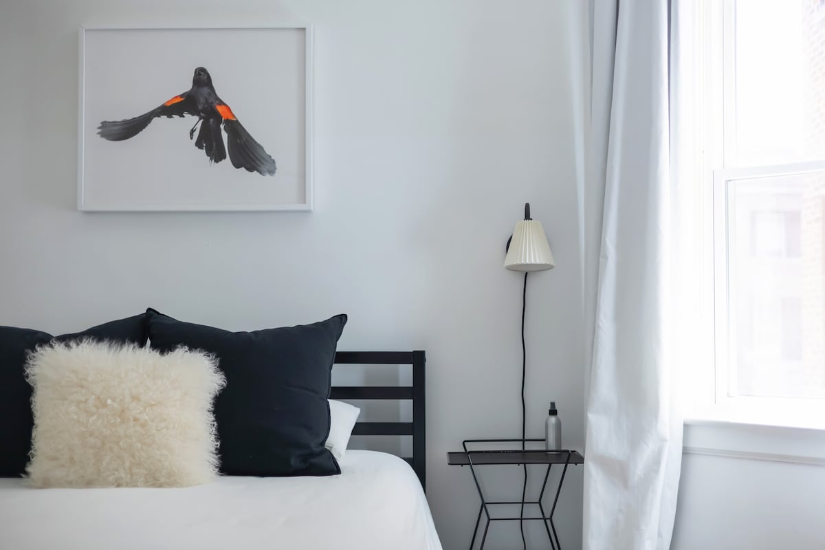 Take morning drinks through the sunshine-yellow room to the back porch, or watch light dance on translucent walls and glossy black and white hardwood floors. Eclectic design includes a mix of new and vintage furniture, and a collection of art and design books for guests to enjoy. This unit is owned by an artist couple who split their time between Tucson, AZ and Chicago. This is their personal unit when they're in Chicago. Come stay here to get away, be comfortable, relax, and be inspired.