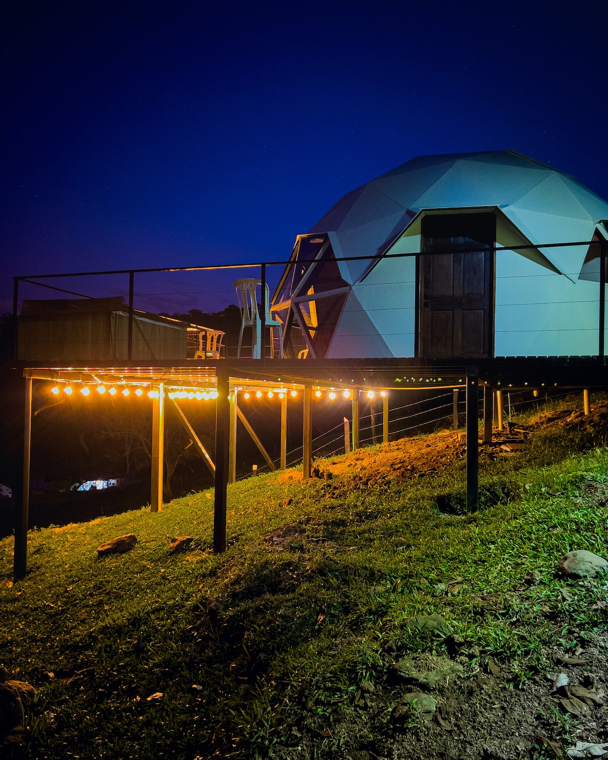Ubicado en una espectacular plataforma aérea, con una increíble vista panorámica se encuentra el Domo/Glamping Lulú. Su cama King con plumón asegura noches de ensueño, y su estructura ofrece calidez en las noches frías de la montaña. Este Domo/Glamping es ideal para crear recuerdos inolvidables. Cuenta con mesa de comedor, ducha de agua caliente, y una cocina completamente equipada. Estar en su balcón es desconexión total… el mejor espacio para leer y conversar.