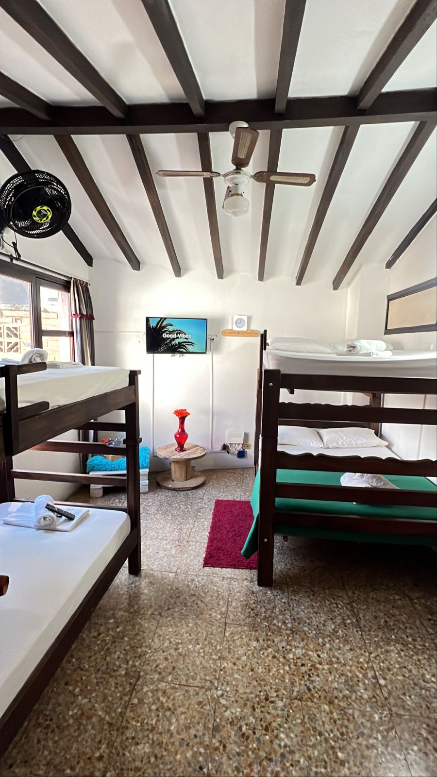 Es un hostal contamos con una habitación con familiar con baño privado que cuenta con una cama doble una litera doble y dos literas sencillas es decir, que tiene capacidad de máximo diez personas.Además cuenta con ventilador y acceso a zonas comunes como son la piscina, el jardín y la zona de hamacas.