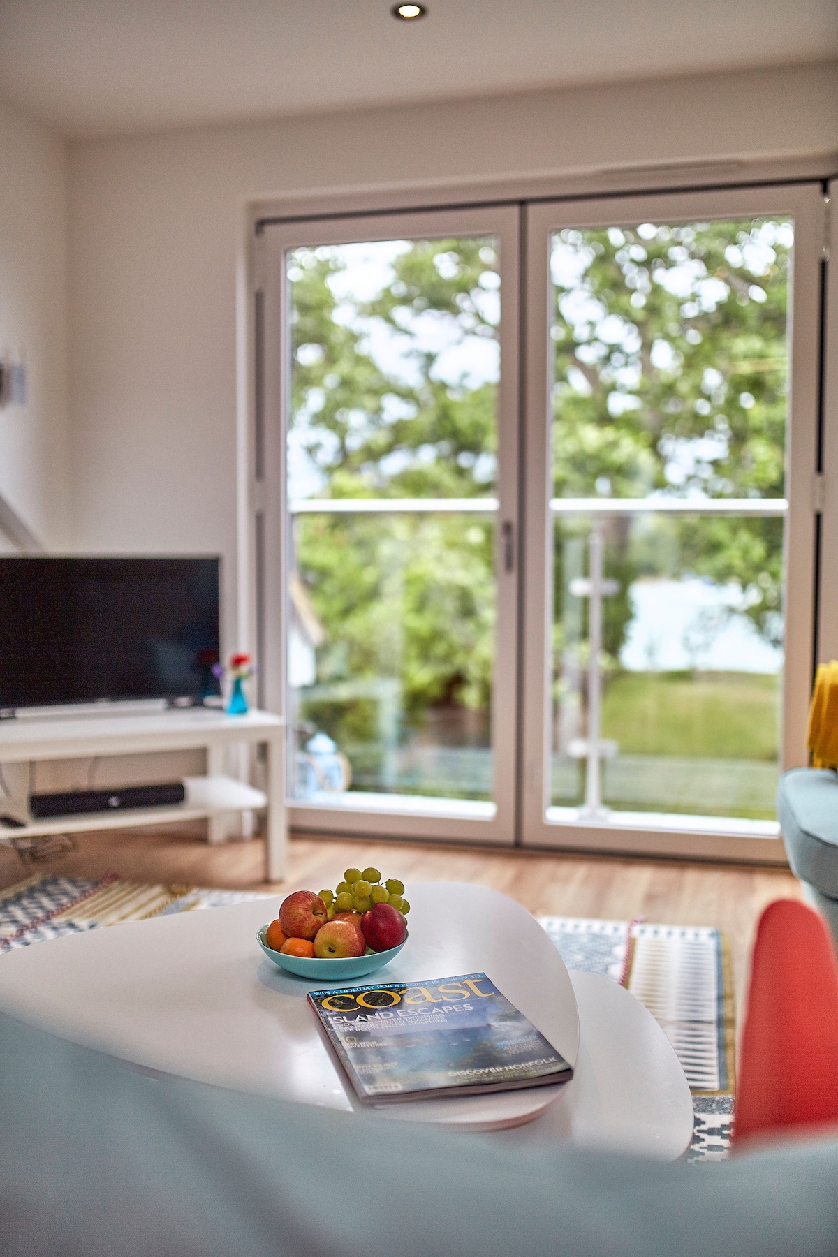 A tranquil retreat for two, Salterns Loft is a first-floor apartment equipped to a high standard. It is accessed through a separate entrance and up a spiral staircase. The large open-plan living area has a fully fitted kitchen and bi-fold doors opening onto a Juliet Balcony with great views over an extensive garden to Chichester Harbour, Tournerbury Woods and the South Downs beyond. The airy bedroom has a king-size bed with en-suite bathroom featuring walk-in shower and double sink.