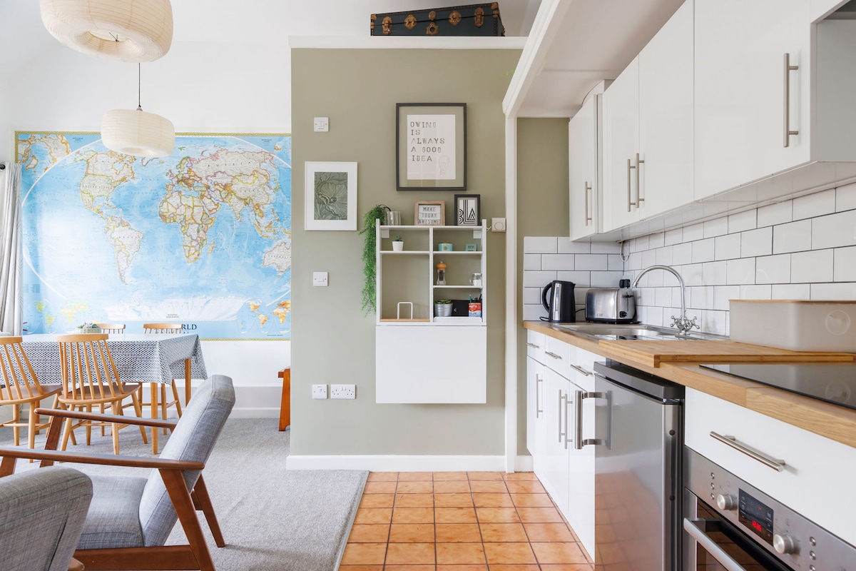 A beautiful, spacious, light and airy self contained garden studio. 3 minutes walk to Chichester town centre, with Theatre, cinemas, Pallant Gallery, Cathedral, restaurants and bars. Continental style breakfast included. FREE PARKING ON OUR DRIVEWAY, NOW WITH EV CHARGER (type 2) at extra cost. Two minutes to train station/free buses to Goodwood events. Lovely canal walks and country pubs. Great outdoor space with dining and bar area, sun umbrella and outdoor heater.