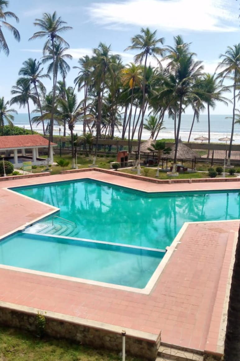 Hermoso Penthouse Vacacional frente al Mar para 8 pers. * 1 Habitacion con 2 camas matrimoniales *Sala con 2 sofacamas matrimoniales. * 3 baños completos * Desayunadero *Nevera * 1 puesto estac techado. * Ventana panorámica con vista al mar. * 2 Hamacas * Terreza privada ✅ Utensilios de cocina. Airfare ✅Cocina electrica , otra cocina con Bombonas de Gas ✅lencería. ✅Wifi ✅1 Smart TV pantalla plana El Conjunto tiene piscina y parrilla *Penthouse Equipado.