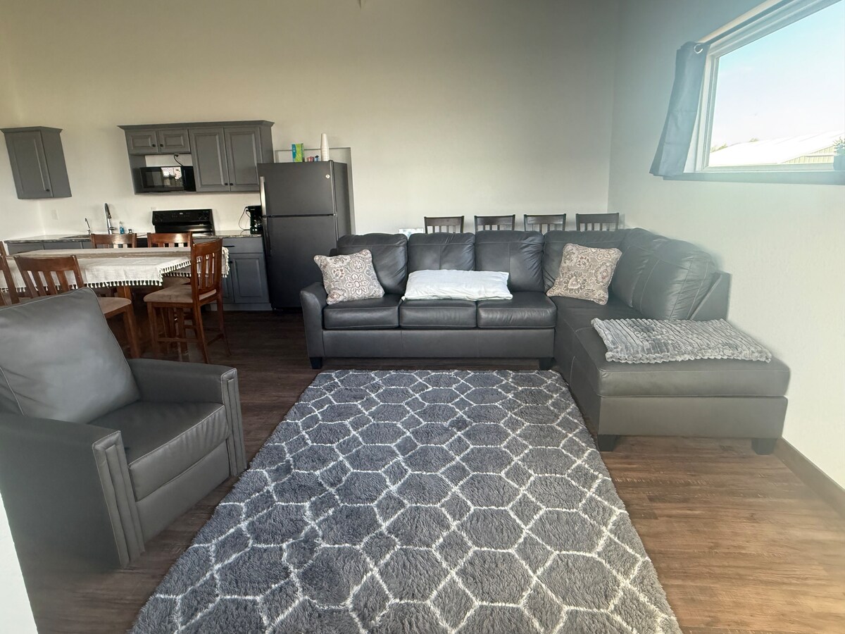 Kick back and relax in this comfortable, newly remodeled upstairs apartment. Located in the center of town for your convenience. Within walking distance to grocery store and downtown amenities. This apartment features a comfortable living room along with a fully functioning apartment sized kitchen with complementary coffee and tea. There is a king sized bed in the bedroom. The couch in the living room would pull out for two small children to sleep on or one adult.