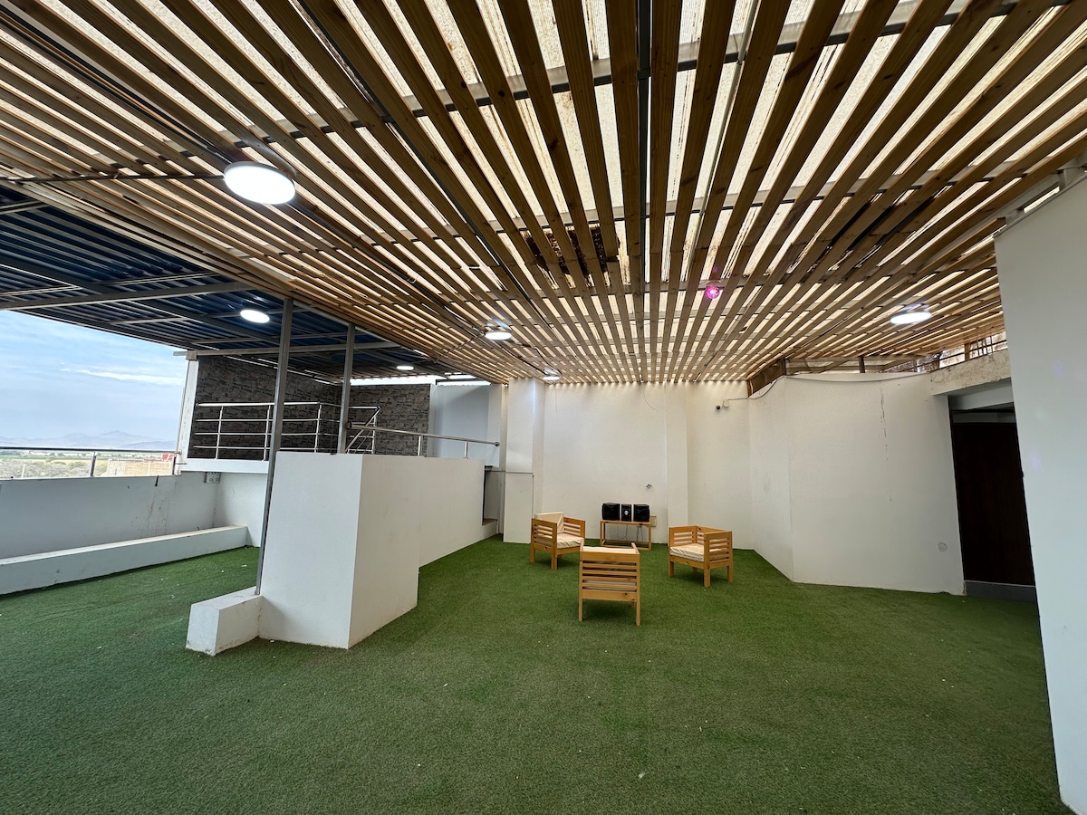 Welcome to your peaceful home in Chiclayo! This stylish first-floor apartment is quiet and secure. Enjoy filtered water, fast internet, smart tv w/ local channels and Netflix, hot showers, A/C, and modern extras like a dishwasher, clothes washer, dryer, and microwave. The building has 24/7 guarded access, and there are no stairs to climb — perfect for families, seniors, or anyone who values comfort and convenience. You’ll feel relaxed, safe, and right at home from the moment you arrive.