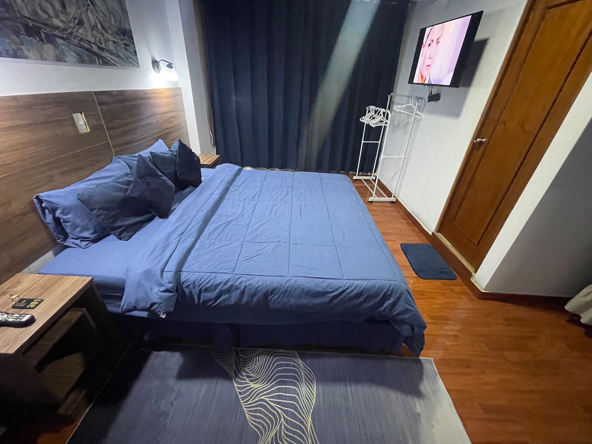La Suite Matrimonial te espera con un ambiente cálido y cómodo. Disfruta de un baño privado equipado con un jabón corporal nuevo, toallas limpias y todo lo necesario para tu bienestar. Relájate viendo tu canal o película favorita en la TV. También tienes una mesita con silla para trabajar o simplemente sentarte a descansar, un amplio clóset para guardar todo tu equipaje y una práctica mesita de noche. Ideal para parejas que buscan tranquilidad y comodidad.