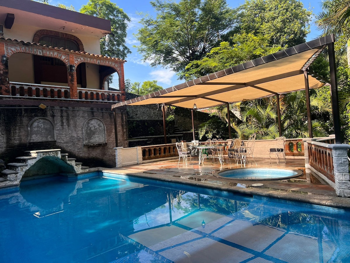 Near Cuernavaca, Chiconcuac, Rubelinas, Acamilpa, Xochitepec. "Las Estacas" El Rollo. Tequesquitengo. XOCHICALCO,TAXCO,"Los Jardines de México". You'll Love my place because you may relax,read and lie down in the Hamacas. You'll enjoy the Argentinian asador for a Grilled Barbecue aside The Pool W/ Hot Jacuzzi. Manuel Parra's proyect.(Casa Fuerte del Indio Fernandez,San Ángel).High fresh ceilings. Mi house is great for families with children & pets. Trampoline. Ping-Pong & the Best Weather!
