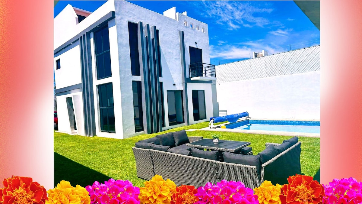 - Crea recuerdos inolvidables en este alojamiento único y familiar. - La casa cuenta con alberca privada, tobogán, parrilla, gran espacio, seguridad, aire acondicionado y comfort. - Cuenta con 2 recamaras en PB con acceso personas discapacitadas. Y 3 recamaras en primer piso. - Se incluye servicio de aseo de 10:00 am a 3 pm. - En caso de requerir que la persona les apoye despues de las 3 pm y hasta las 6pm seria con un costo adicional.