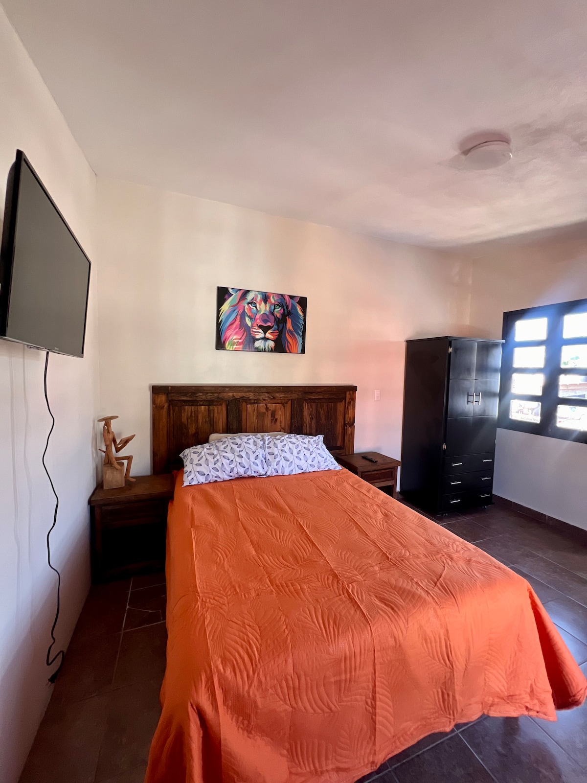 El hospedaje se encuentra en el primer piso, cuenta con una recamara con dos camas matrimoniales ,plancha burro de planchar, pantalla,una cajonera un pequeño tocador un buró,como decoracion una pintura al óleo y una lámpara artesanal. Aparte cuenta con un espacio que se utiliza como sala comedor y cocina. La cocina tiene horno de microondas, refrigerador, cafetera,licuadora, parrilla y utensilios necesarios para cocinar. Una ventana que da a la calle y un bañó completo