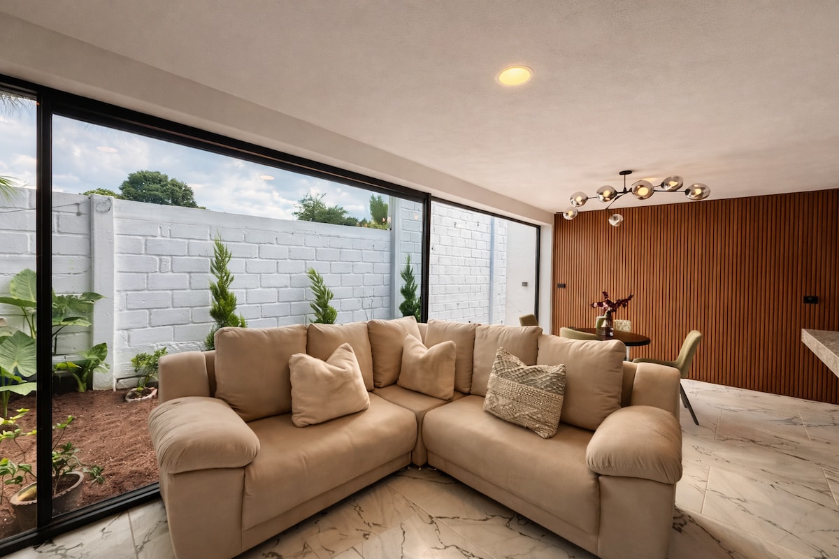 Moderno departamento localizado a 12 minutos caminando del centro histórico, a 3 minutos en automóvil y a tres cuadras del mirador de la barranca. El alojamiento brinda con un máximo de 10 huéspedes y un mínimo de 4 huéspedes, con 3 habitaciones, 2 baños y el espacio para 2 autos en estacionamiento interno, contamos con todos los servicios para que tu estancia sea placentera y confortable como en tu hogar. 🍃