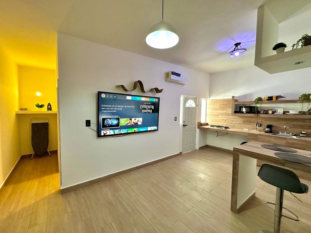 departamento ejecutivo para dos personas con áreas limpias cuenta con un sillón cocineta y barra baño con tina y una cama matrimonial Disfruta de la sencillez de este alojamiento tranquilo y céntrico.