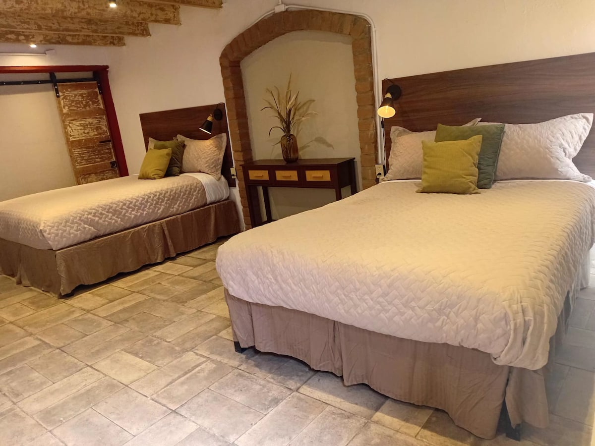 Disfruta de una estancia cómoda y relajante en la habitación Leonor de Villa Reyna Hotel Boutique. Esta habitación cuenta con 2 amplias camas Queen size, ideales para descansar después de un día de actividades o trámites. Su ambiente acogedor está pensado para brindarte tranquilidad. Nos ubicamos a solo 3 minutos del cruce internacional hacia El Paso, Texas, lo que la convierte en una opción práctica y estratégica. Ya sea por viaje, descanso o visita, aquí encontrarás el lugar perfecto.