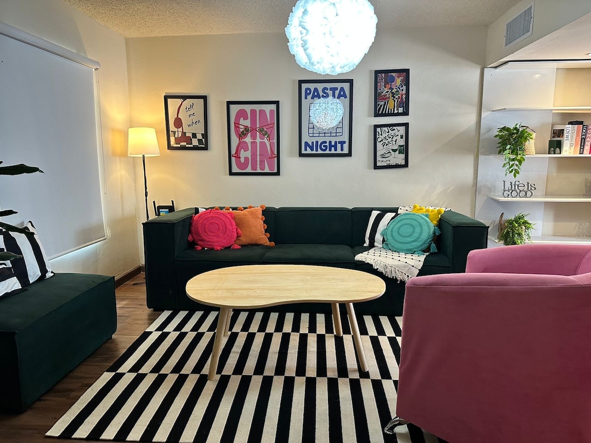 Casita del Arco is a bold and charming one-bedroom duplex in Central El Paso, named for its stunning arched window and desert views. Thoughtfully restored, it blends original details with playful, modern design—vaulted black ceilings, original tiled fireplace, and bright accents throughout. Walk to Memorial Park and the Rose Garden, or relax in this sunny, artful space with a private entrance and shared front porch. If you're traveling with friends check out our adjacent unit, Casita Tierra Rosa