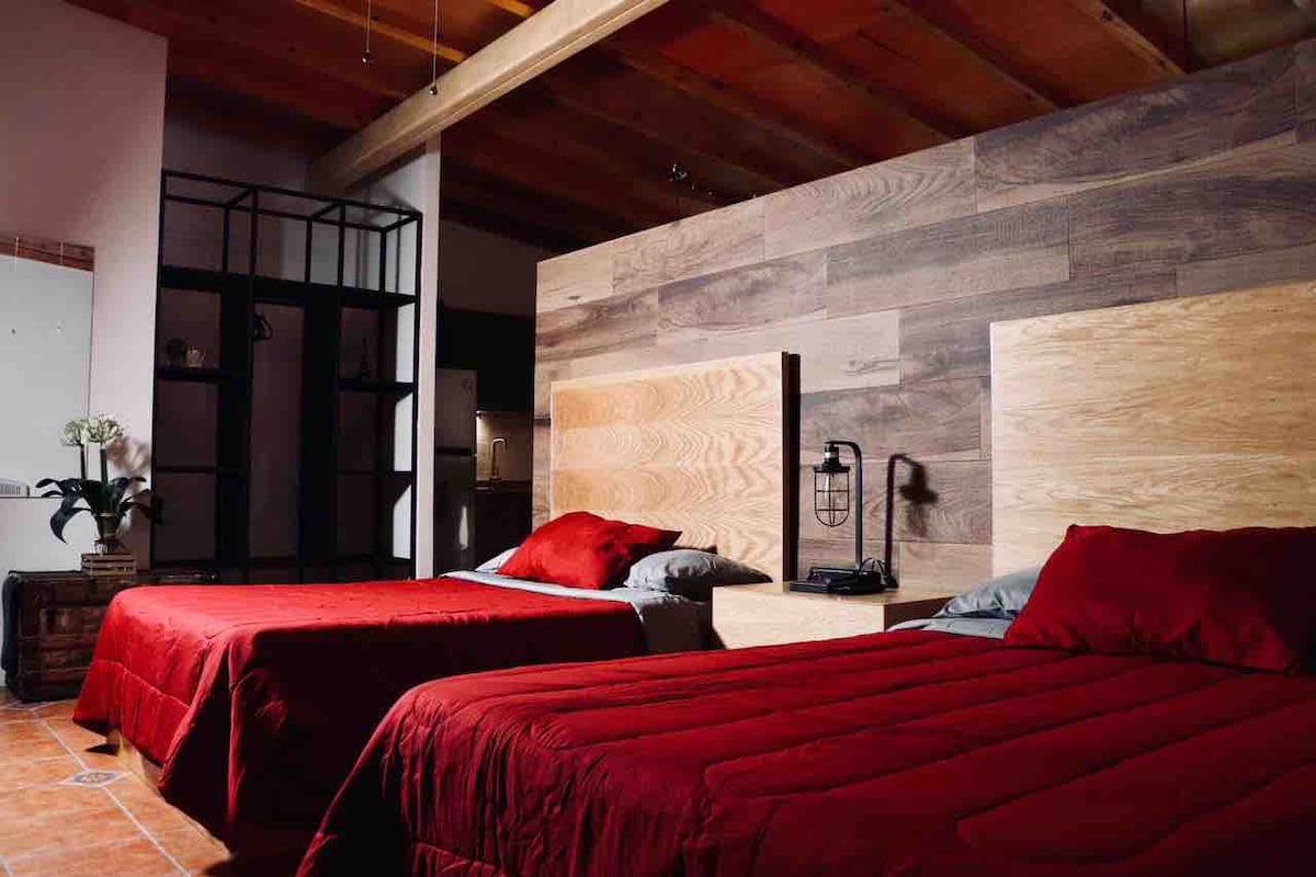 Bienvenido a tu LOFT urbano estilo cabaña! Estamos ubicados en una zona familiar y segura con una excelente ubicación. Envuelvete en nuestros modernos espacios con ese toque rústico y disfruta del clima con una agradable terraza con vista al jardín. El LOFT cuenta con cochera techada, entrada independiente y cámaras de circuito cerrado al exterior. Te encuentras a solo 12 minutos del centro histórico, y a 5 minutos de la zona más moderna de la ciudad Distrito 1.