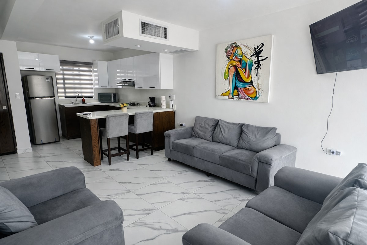 Bienvenidos a nuestro acogedor Departamento a poca distancia de restaurantes y tiendas! Este apartamento es perfecto para parejas o para pasar la noche cómodamente, es privado y cómodo para descansar o trabajar desde un dispositivo movil. Está ubicado en un segundo piso, de fácil acceso.